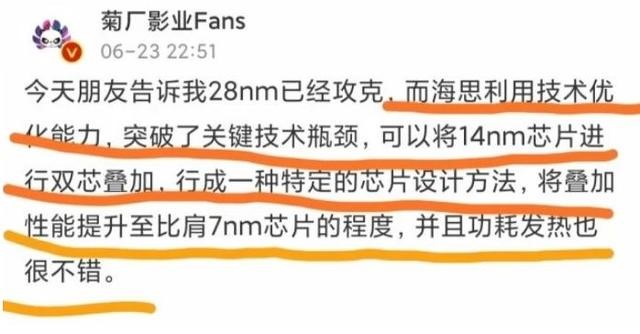 不過,在6月23日,知名科技博主菊廠影業Fans就帶來了一則好消息。海思研發出了一種全新設計方案,有望繞過EUV光刻機,實現等效7nm芯片生產。
